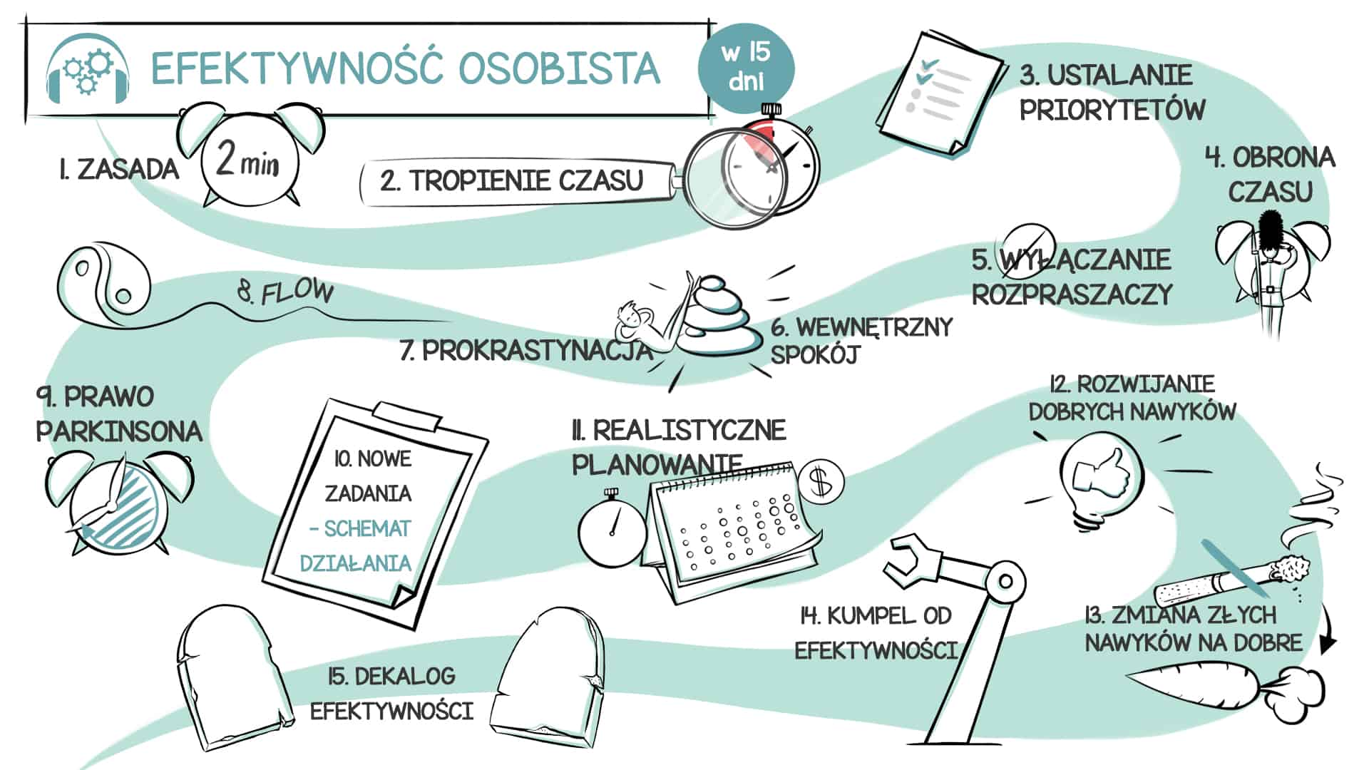 Nauczysz się łączyć wszystkie elementy z kursu w jedną spójną całość. Poznasz Dekalog Efektywności, który podsumuje poznane techniki i pokaże związki między nimi.